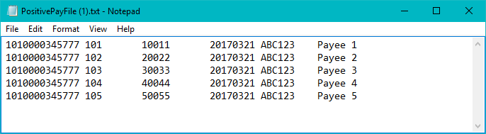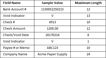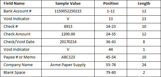 Positive Pay layouts can vary from bank to bank. For this reason, you may need to setup a layout that meets the specifications for your bank.