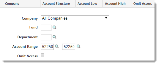 When adding a Detail line, you have the option to leave fields such as Company, Fund, and Department blank. For example, if you wanted to give rights to account 52250 in all companies, you could specify a range of "52250 - 52250" without specifying any levels above it.