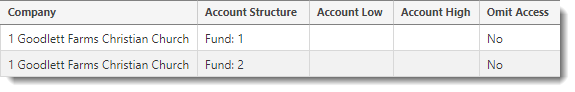 Within Company 1, this role has rights to everything in Fund 1 except Department 100 and it also has rights to everything in Fund 2.