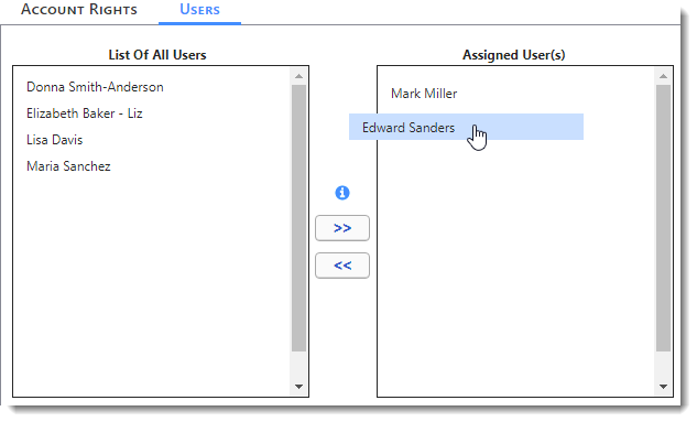 The Users tab allows you to assign an Account Rights Role to users. Once an Accounts Rights Role is assigned to a user, that user has all the access rights that have been specified for that role. Click and drag the appropriate users from the List Of All Users box to the Assigned User(s) box.