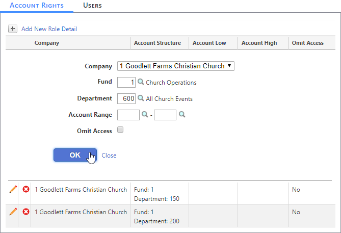 There is also an Omit Access check box. This check box allows you to specify which accounts, and account structures a role does not have access to.