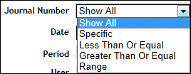 - Journal Number: Selecting any option other than Show All displays field(s) so you can input the number(s).