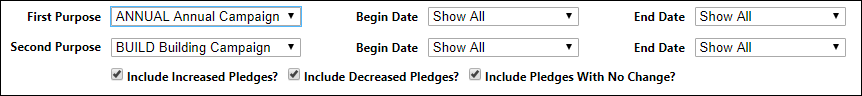 The Pledge File List report allows you to print lists of contributors that have made a pledge along with pledge balances, contributors that have not pledged, those who have pledged and not contributed., or other combinations of contributors and pledgers. The array of options available in this report gives the user a flexible and powerful tool for giving and pledge analysis, as well as information that can be useful in stewardship drives.