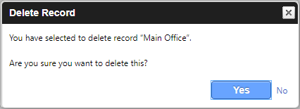 Deleting a type that has records assigned When deleting a type that has records assigned, the "Alert Message" or "Confirm Delete" window appears. Alert Message In some cases, you cannot delete a Control Table type after it has been assigned to a record. The Alert Message window displays how many records are assigned to that type. Confirm Delete In other cases, you are allowed to delete a Control Table type after it has been assigned to a record. The Confirm Delete window displays how many records are currently using the type.