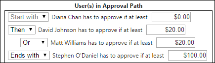 Continue adding users to the Approval Path as desired. For each subsequent user you can specify Or or Ends with in the drop-down list. When a user is set to Or with another user in the Approval Path, only one of them needs to approve the Requisition for it to move forward in the path. If you have a user set to Ends with and you add another user beneath them, their drop-down list changes to Then. The final user in the Approval Path is set to Ends with unless you only have one person in the path. The Requisition does not become a Purchase Order or Check Request until the final approver has approved it.