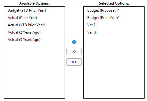- Available Options and Selected Options - You can also customize what you want to display on the report by using your mouse to drag options horizontally between Available Options and Selected Options. You can also drag options vertically to re-order the Selected Options column. We recommend you drag items between the columns rather than using the ">>" and "<<" buttons since those buttons move all items.
