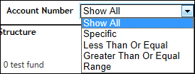 - The Account Number filter allows you to further narrow down which accounts you want to display on the report. Selecting any option other than Show All displays fields so you can input the numbers.