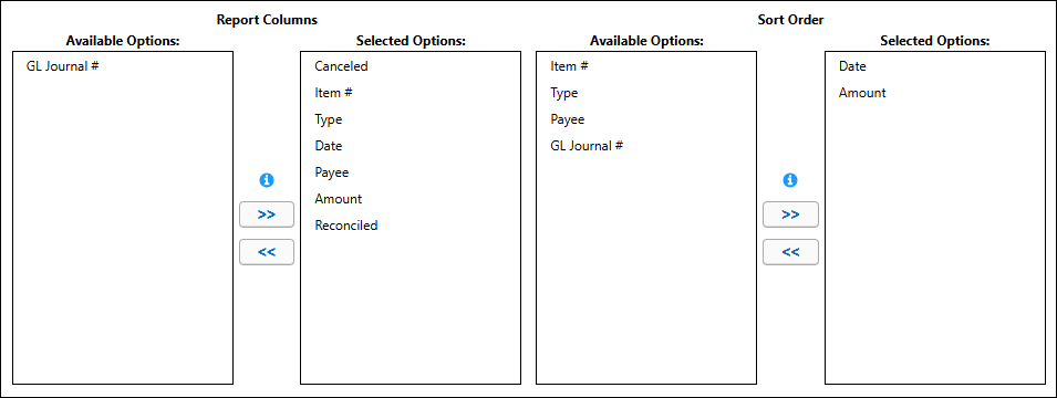 - Report Columns and Sort Order - You can customize what columns display and how you want the report to be sorted by using your mouse to drag options horizontally between Available Options and Selected Options. You can also drag options vertically to re-order the Selected Options columns. We recommend you drag items between the columns rather than using the ">>" and "<<" buttons since those buttons move all items.