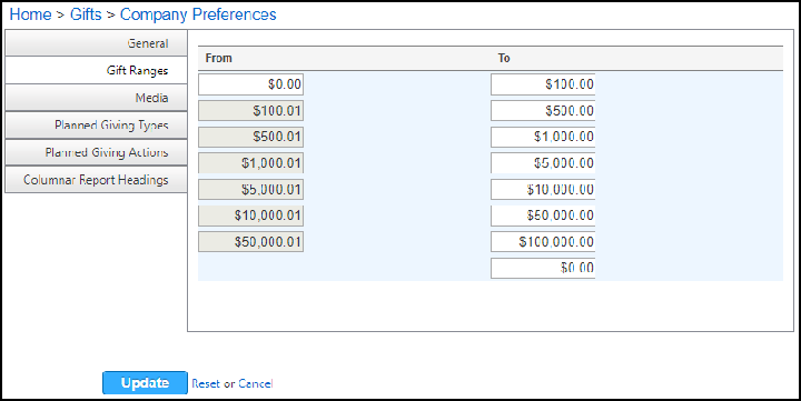 Specify the gift ranges From and To. You can add a new row by typing an amount in the last field under the To column and then press the Tab key on your keyboard. To remove a row, change the amount to $0 under the To column and then press the Tab key. See the example below.
