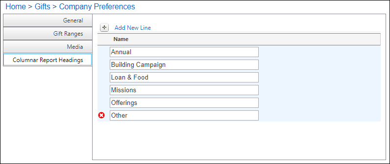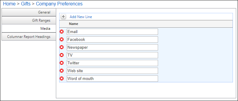 Click Add New Line to add the various types of media used to promote giving. See examples below.