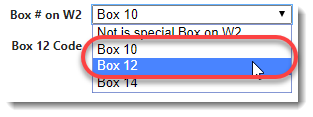 Enter a Description for the deduction and then select the Box # on W2. See your Department of the Treasury Internal Revenue Service Instructions for Form W-2 Wage and Tax Statement for more information. If you select Box 12 select the appropriate Box 12 Code.