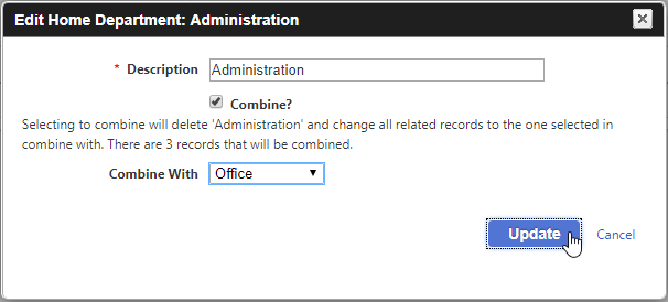 Editing a type consists of either modifying the description or combining it with another type. If a type is modified, then the records assigned to that type are also modified. If a type is combined, then the records assigned to that type are changed to the Combine With type specified during the combine process.