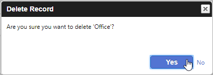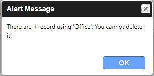 Deleting a type that has records assigned When deleting a type that has records assigned, the "Alert Message" or "Confirm Delete" window appears. Alert Message In some cases, you cannot delete a Control Table type after it has been assigned to a record. The Alert Message window displays how many records are assigned to that type. Confirm Delete In other cases, you are allowed to delete a Control Table type after it has been assigned to a record. The Confirm Delete window displays how many records are currently using the type.