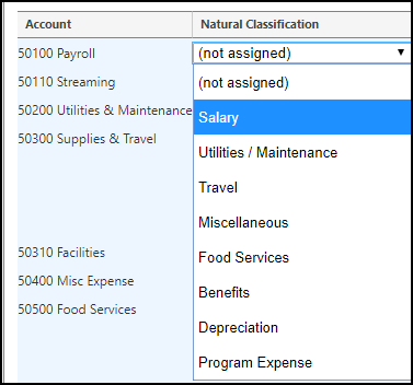- Use the pull-down arrow for the Expense Code to assign the code to the Natural Classification. Here we are selecting 50100 Payroll and assigning it to Natural Classification of Salary.