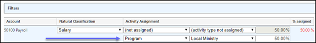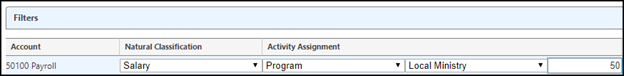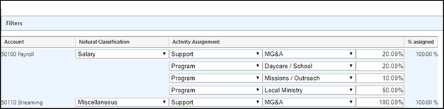 The screen shot below shows two accounts that are set up correctly. Notice that 50100 payroll totals show in four columns, Local Ministry, Missions/Outreach, Daycare/School, and MG&A.