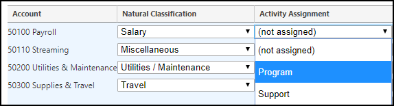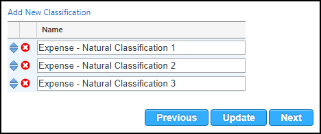 The wizard includes three undefined classifications. Change the descriptions by just typing over the placeholder descriptions. Natural Classifications include descriptions similar to Salary, Utilities/Maintenance, Depreciation, Program Expenses, and so forth.