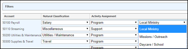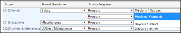 - Continuing with 50100, we will choose Program again and use the pull-down arrow to choose Missions / Outreach. Also, notice that Local Ministry is not an option because it is used in step 9.d above for account 50100.