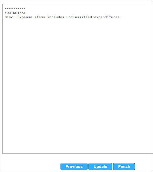 - The Footnotes screen is a large text box. Enter any information needed to clarify entries on the report. For example, how miscellaneous expenses are used, a change in net asset allocations, and so forth.