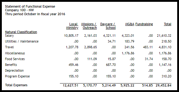 Approach: Before starting to construct the report, you should identify your programs and support activities. Programs might include such activities as Intercity outreach, local missions, foreign missions, Adult Ministries, Youth Ministries, Mothers’ Day Out, etc. Then, group similar programs together for the report. For example, select groups like Local Ministry, Missions/Outreach, Daycare/School. Two additional columns are required: Marketing, General and Administrative (MG&A) and Fundraising. For natural classifications define broad categories of expense activities, such as Benefits, Program Expense, Utilities/Maintenance, etc.