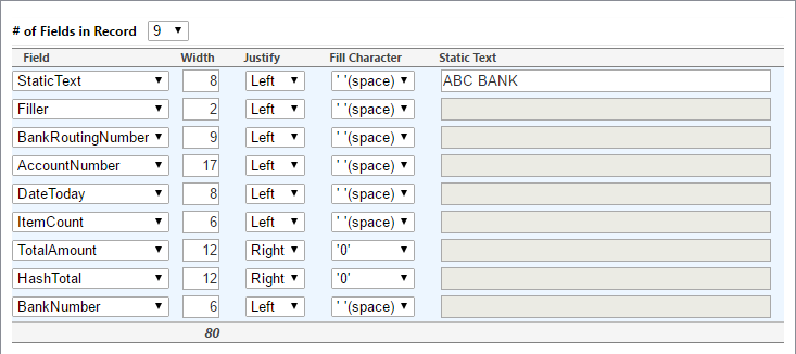 - Filler: This field is filled with either blank space or zeros as designated by the Fill Character drop-down.