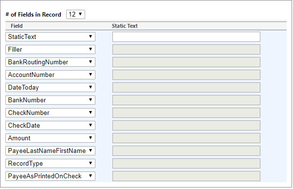- RecordType: Sometimes referred to as the "Check Issue Record", this field indicates which transaction is a check or void by using the single character designation assigned on the Bank Account Information>Update\Account Information tab in the "Record Type Check" and "Record Type Void" fields.