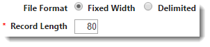 File Format: Select either Fixed Width or Delimited. A Fixed Width file typically has one entry per row, with each column having a fixed width (specified in characters) that determines the maximum amount of data it can contain. No delimiters are used to separate the fields in this type of file. A Delimited file contains a special character to separate one column of data from the next. Depending on whether you choose Fixed Width or Delimited will determine which of the following options display.