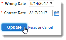 - Select the incorrect date that was specified when processing payroll using the Wrong Date drop-down. Select the date that should have been specified when processing payroll using the Correct Date field. Click the Update button after you have correctly specified the "Wrong" and "Correct" dates.