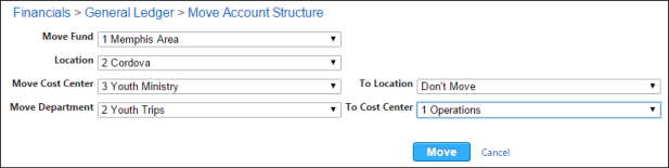 Example In the above example we are moving the Youth Trips Department from the Youth Ministry Cost Center to the Operations Cost Center. If we instead select a different location from the To Location drop-down list, we are moving the Youth Ministry Cost Center to a different Location. In this case, all levels below it automatically move with it. Because Fund and Location are the top levels for the balance sheet and budgeted areas of our account structure, we cannot move them. Other things to note are that you cannot move Cost Center 0 to a new Location as it contains the balance sheet accounts for the Location from which you are trying to move it. If you attempt to do this you are not able to complete the process and an exception prints on the report. You also cannot move an individual Department to a different Location. You can move a Department to a different Cost Center. Note: If you are only using Funds and Departments you are not able to access the Move Account Structure utility as there is nothing you can move. Your account structure must use at least Fund Groups or Cost Centers in order to use this utility. |