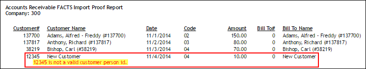 The Customer # field refers to the Name ID within the program. If a number in the file does not match a name, a note in red indicates that the referenced Customer# is not a valid customer person id.