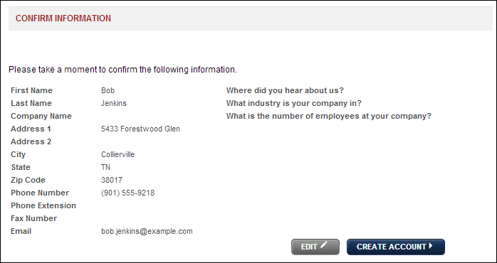 The Confirm Information page allows you to review all of your account information before creating your account.