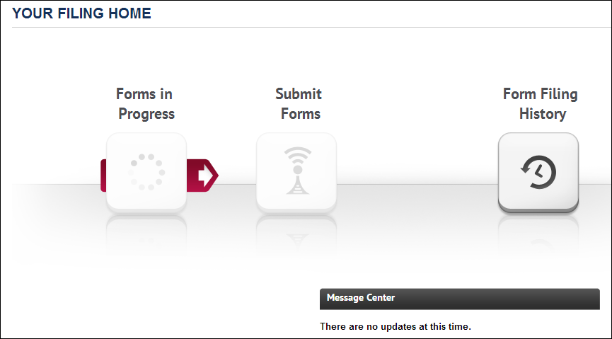 The Your Filing Home page allows you to view at which part of the process you are (in case your progress was interrupted) and also access Form Filing History. Any messages are listed in the Message Center.