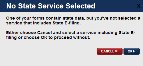 If you click Next without selecting a service option that includes state filing and you have at least one employee in the grid that pays state taxes, you receive the following message: