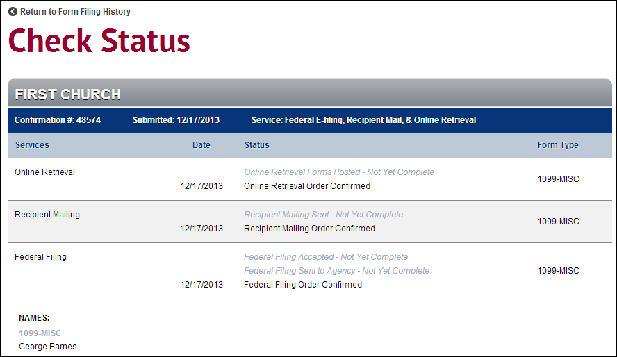 The names of your employees or vendors and the forms that were submitted for them are listed below the grid. Click the Return to Form Filing History link to return to the Form Filing History screen.