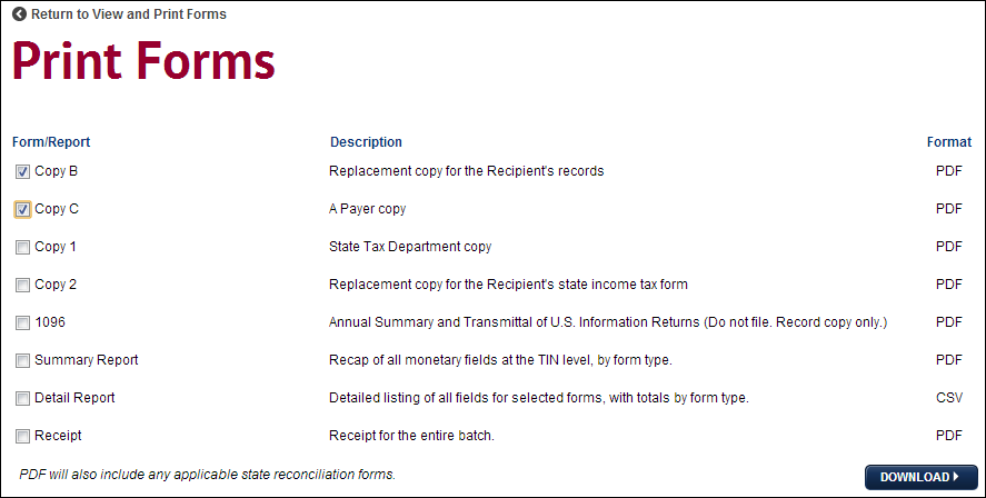 Select the Form/Report(s) that you wish to print and then click the Download button to be prompted to download the items you have selected.