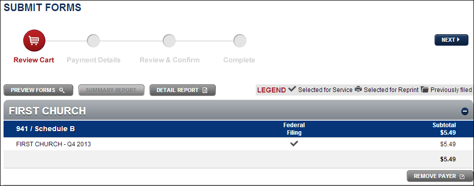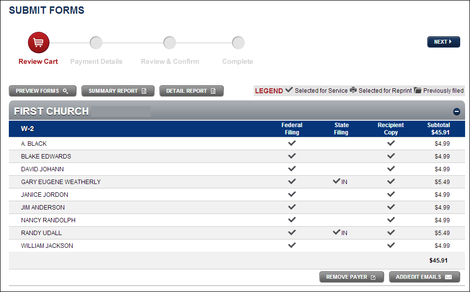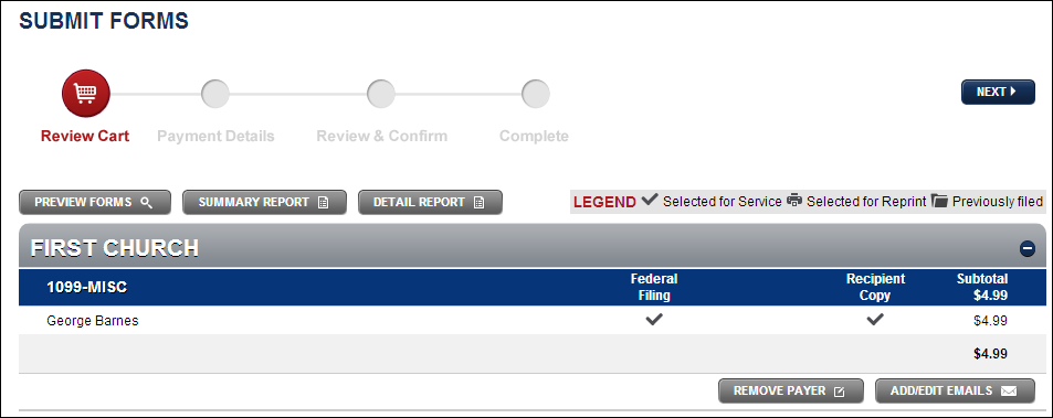 Click Summary Report to be prompted to download a summary report in PDF form. The Summary Report summarizes all forms currently in your forms cart or in your submitted forms section. The reports are separated by Payer (Company) and Form Type.