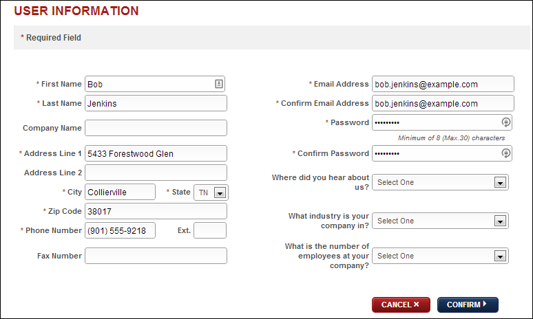 Click the Create Account link to access the User Information page. Fill out the form (fields with asterisks are required) and then click Confirm to create your account or the Cancel link to return to the main E-File screen.