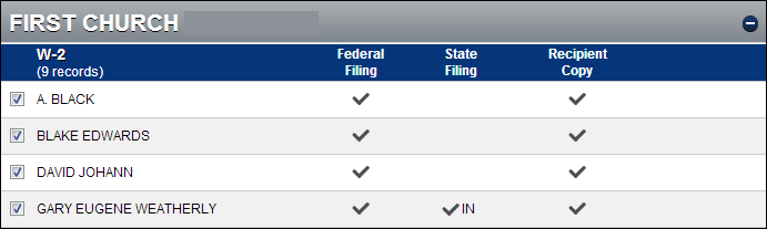 The grid displays a header for each Payer (Company) that you have exported to E-File. In the grid, remove the check from any employee for which you do not want to electronically file. In the State Filing column, the state abbreviation from the employee record (if any) is displayed. If you are not filing state taxes, the state abbreviation is grayed out with no check mark. The Recipient Copy column has a check if you are using that service.
