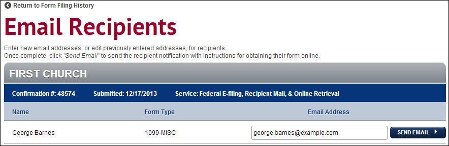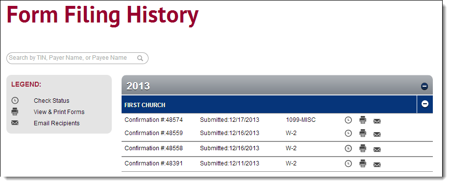 The Form Filing History page displays all of your E-File history broken down by the calendar year. For each listing the grid displays the confirmation number, date of submission, and the type of form submitted. From this page, you can check the status of any previous filings, view and print forms, and email recipients.