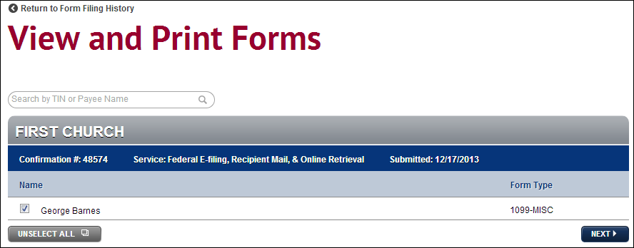 Click the Print icon on the Form Filing History page to access the View and Print Forms screen. Select the employees or vendors for whom you want to print forms. Click the Unselect All button to deselect all individuals in the grid. Click the Next button when finished.