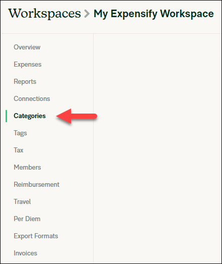 - Next, select Categories on the left. This is where you can add/edit/delete expense categories. Later, you will map these expense categories to expense accounts in your chart of accounts.