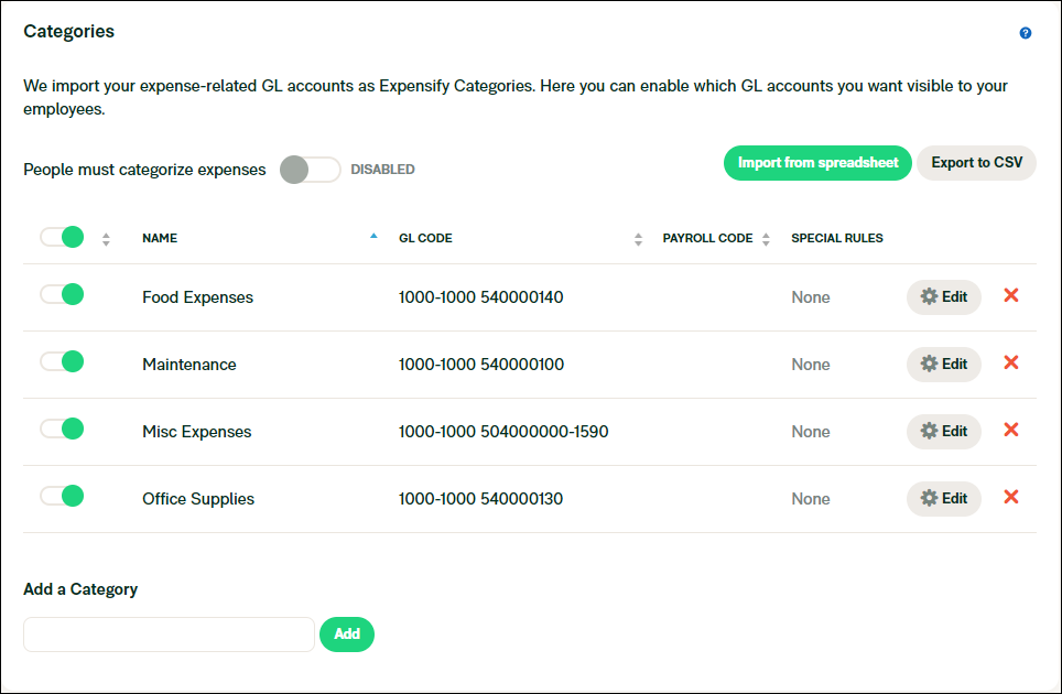 NOTE: The GL Code column shown above in Expensify is for reference purposes only and is not used to automatically map the category in Shelby Financials to that account.